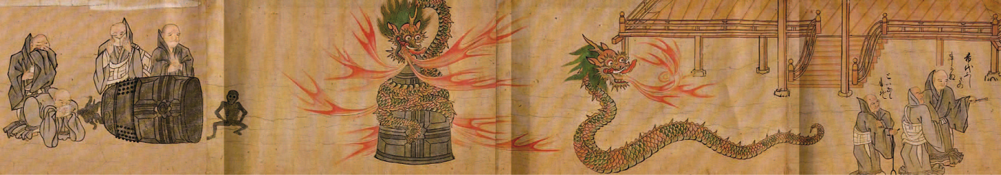 Remember, this was all supposed to be Lotus Sutra propaganda. So one of the wiser monks at Dōjō-ji organized a mass reading of a chapter of the Lotus Sutra, whose miraculous power was enough to save the spirits of both the widow-snake and ash-monk and reincarnate them in less snakey and ashy circumstances.