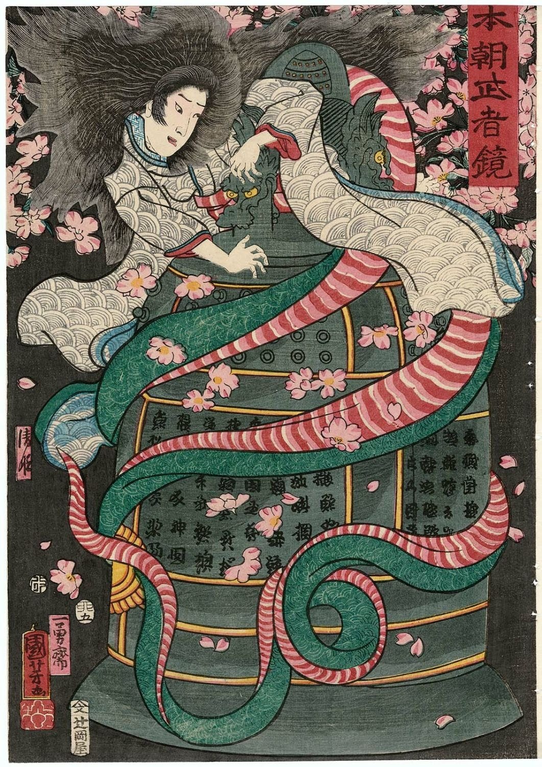 The two monks found themselves pursued by the giant snake, so they took refuge in Dōjō-ji 道成寺, a Buddhist temple. In an effort to hide, the young monk stood underneath the large temple bell which was then lowered over him. Dying of asphyxiation in a claustrophobic space seemed preferable to sexy times with a large, angry snake. This monk don’t want no anaconda unless she’s a chaste nun, hun.