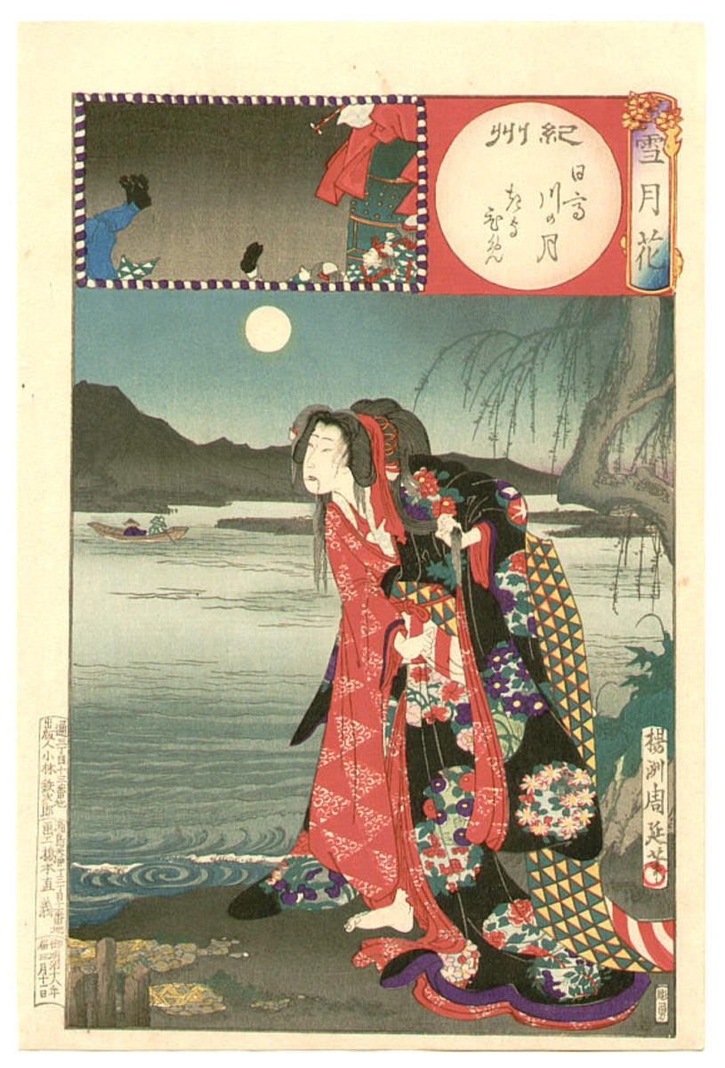 The story is a staple of Nō (Dōjōji 道成寺), Kabuki (Kyōganoko Musume Dōjōji 京鹿子娘道成寺), and Bunraku puppet theatre (many versions), and the river crossing scene in particular is very well known.