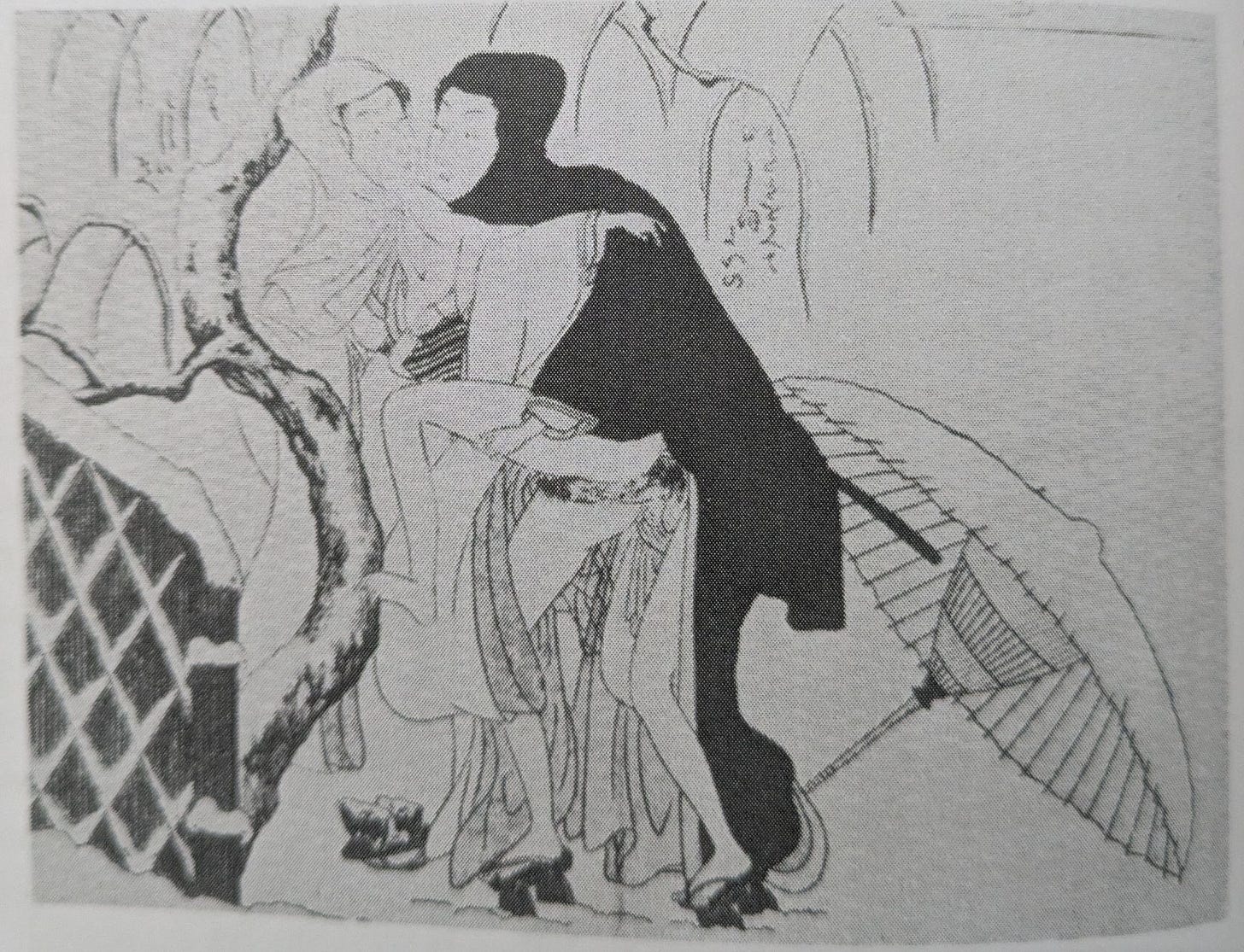 The followup print shows the same couple, no longer so elegant. She leans on that same willow, pulling up her robe for the man about to commit several violations of the Confucian codes of decency. The umbrella lies forgotten. Their dialogue text reveals something funny: they don’t speak in a high-born manner at all.