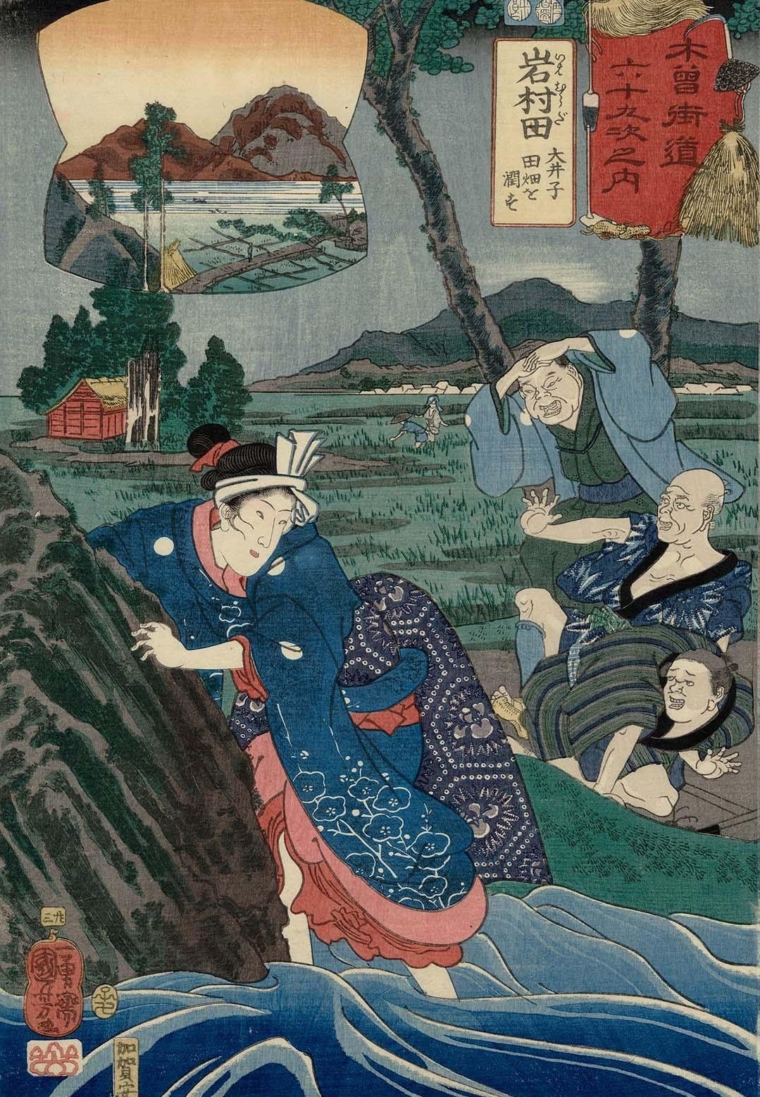 Ōiko was too mighty to be contained by a single tale. There’s a second story about her in the Kokon Chomonjū, where she flexed her negotiation muscles. During a long drought, the farmers in Takashima argued about the distribution of water to their rice paddies. Some of the more foolish ones redirected water away from Ōiko’s rice paddy and into their own. Now Ōiko wasn’t the type to calmly file a formal complaint. She waited for nightfall. She picked up a rock larger than most Tokyo apartments and casually dropped it in the river, redirecting the water back to her paddy.