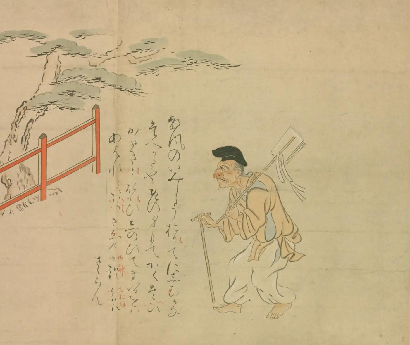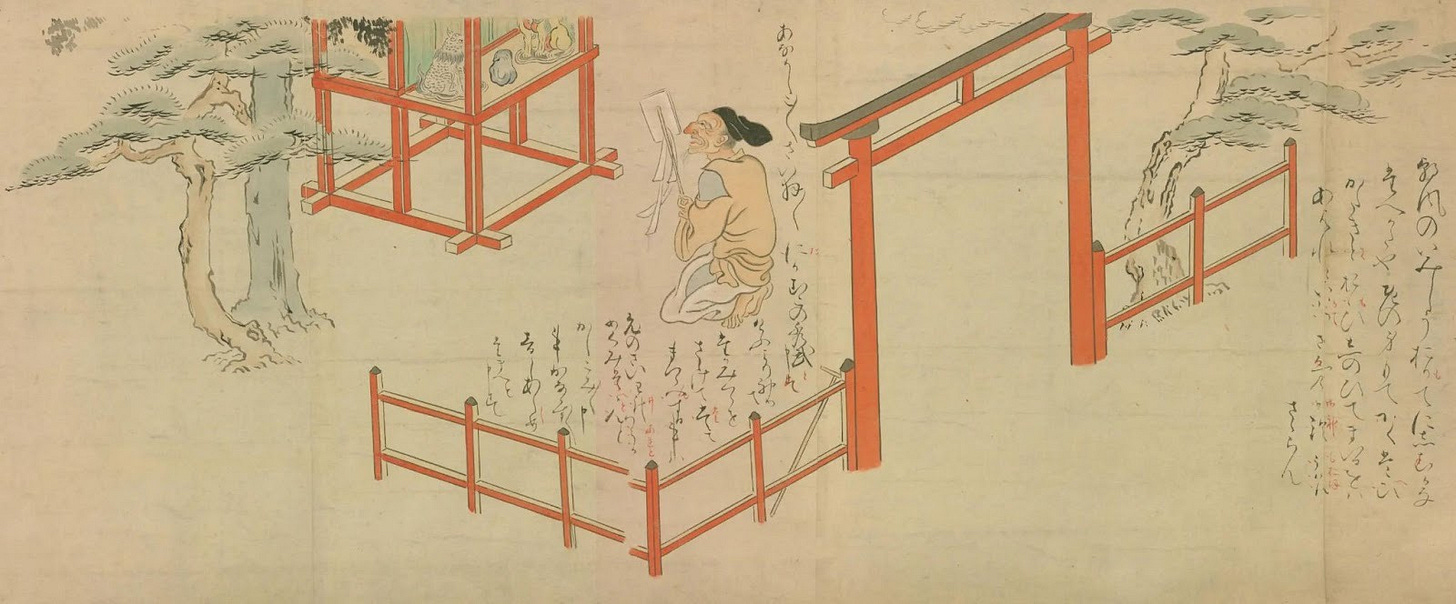 The words say, “The shrine is close now, that’s a relief. The morning wind stings my face and this old body can hardly endure any more. But in spite of all this, if the god of talent sees my miserable state and recognizes my determination, he will have mercy.”