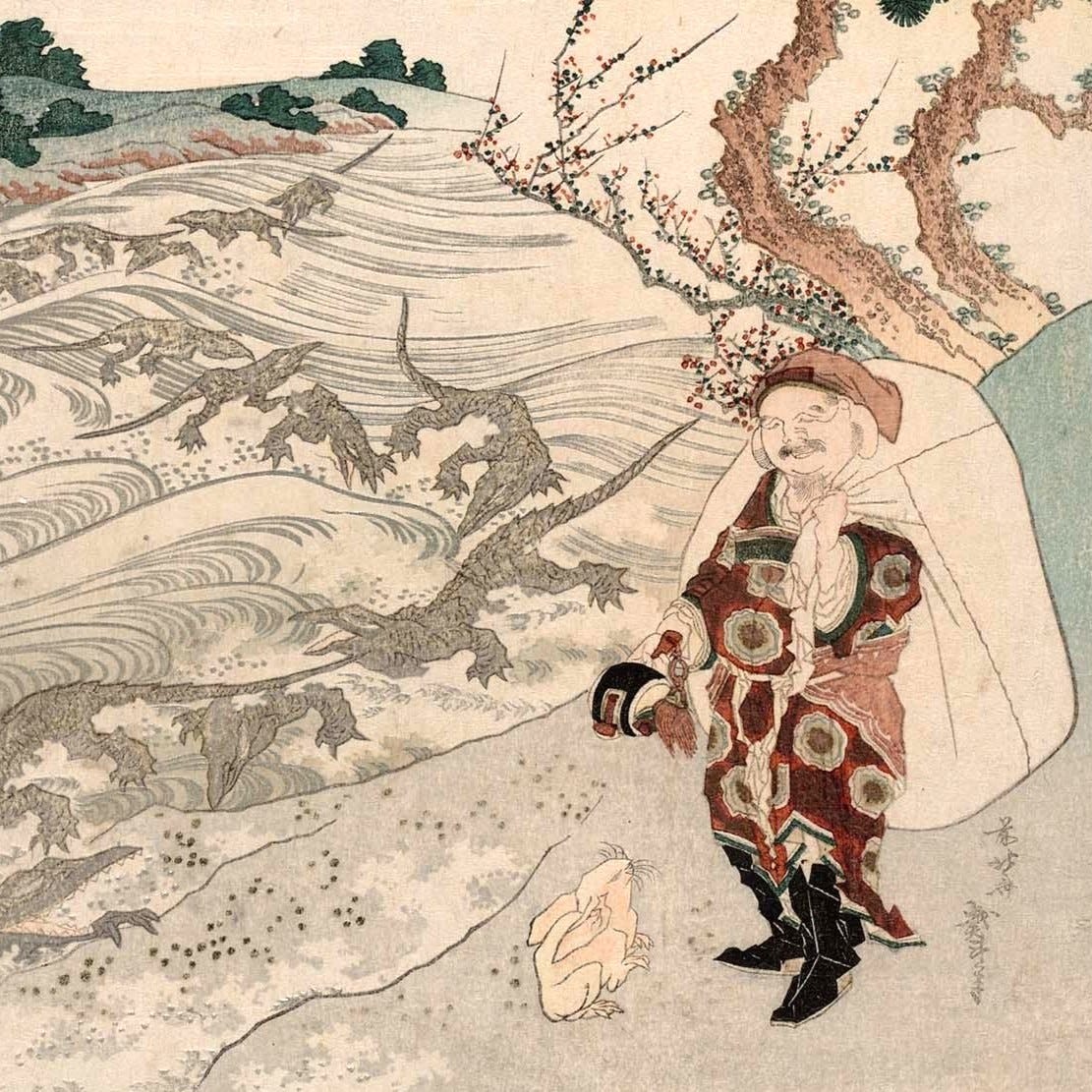 A cute, fluffy white hare once lived on Oki Island, in Inaba Province. He very much wanted to get to mainland Inaba, but the sea was filled with wani (和邇). Literary historians enjoy arguing whether wani should be read “shark,” “crocodile,” “dragon,” or “sea monster,” so I’ll annoy all of them and call them crocosharks.