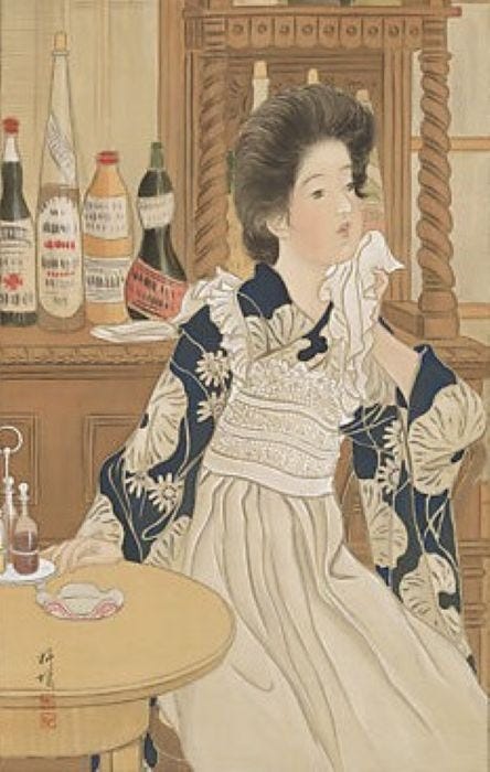 Second, the influx of Osaka money and culture. In Osaka, there were closer, friendlier relations between customers and staff. Many jokyū stopped wearing aprons, started speaking to customers like a friend or a girlfriend would, blurring the lines.
